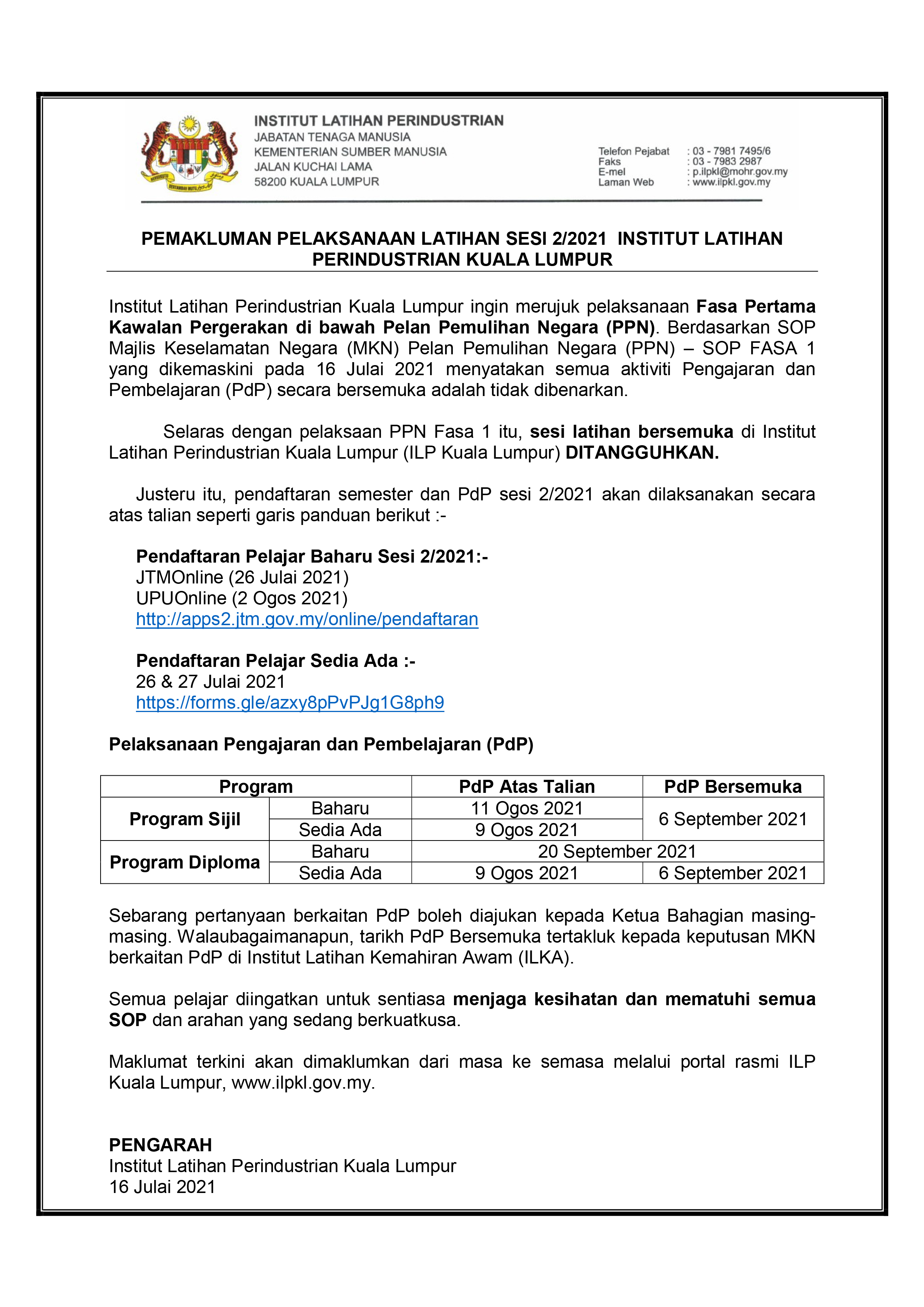 Portal Rasmi Institut Latihan Perindustrian Kuala Lumpur Pemakluman Pelaksanaan Latihan Sesi 2 2021 Ilp Kuala Lumpur